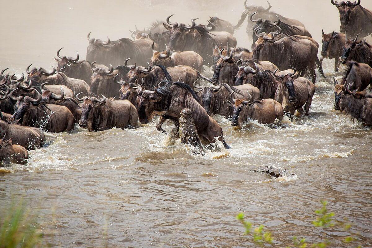 The wildebeest migration crossing at the Grumeti River in Tanzania’s Serengeti National Park is one of Africa’s most breathtaking wildlife spectacles, captivating travelers from around the world.